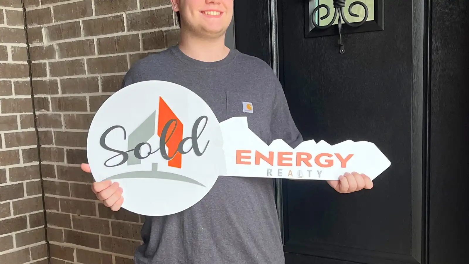 Evan in front of his new home!