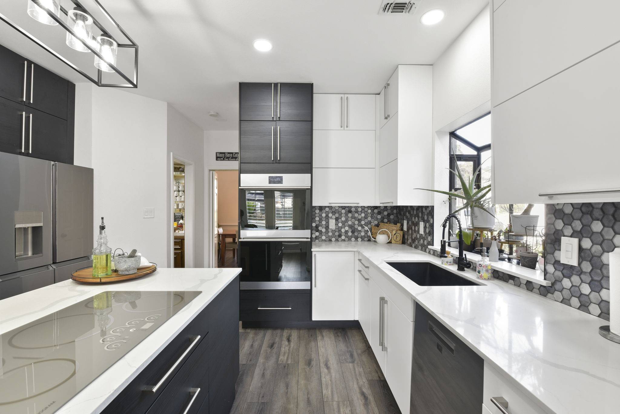 Beautifully renovated 5-bedroom home with swimming pool in sought-after Barkers Landing. This classic home combines timeless charm with modern design, featuring premium waterproof laminate flooring throughout. The fully remodeled kitchen boasts custom cabinetry, quartz countertops, and high-end GE Profile, Café, and Monogram appliances, including a double oven and induction cooktop. An addition above the garage offers a private suite with a spiral staircase and balcony overlooking the pool—ideal for guests, an office, or a gym. The primary suite features a spa-like shower, custom vanity, and huge walk-in closet. Additional upgrades include PEX plumbing, fresh paint, a German schmear brick finish, and a 50-year roof (2018). The renovated laundry room offers custom cabinetry and a deep sink. Plantation shutters, built-ins, and new cabinetry add charm. Never flooded, in one of West Houston's most desirable communities.